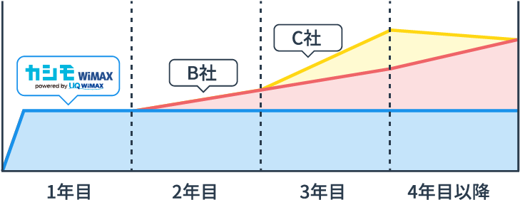「カシモWiMAX」は、月額料金が業界最安値※でご提供しております。不要なオプションなどを一切省き、手続きが必要なキャッシュバック方式ではなく、シンプルで契約後期に月額が上がることのないカシコいプランをご用意しました。