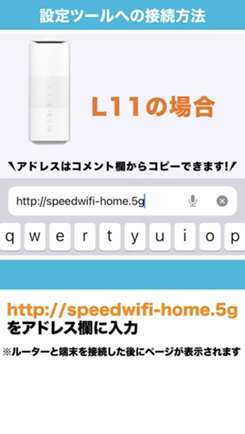 L11と無線LANで接続できる端末(スマートフォン)と接続 > Webブラウザを起動して、アドレス入力欄に http://speedwifi-home.5g と入力 > ログイン画面が表示されたら、L11本体底面に記載されている初回ログインID/パスワードでログイン