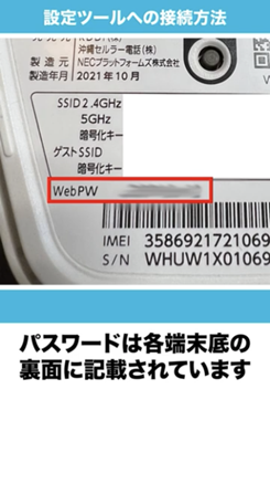 電源を入れたまま、端末裏側のリセットボタンを先の細いもので3秒以上長押しすると、工場出荷時の状態にリセットされます。