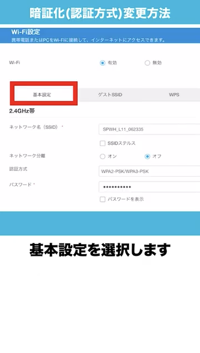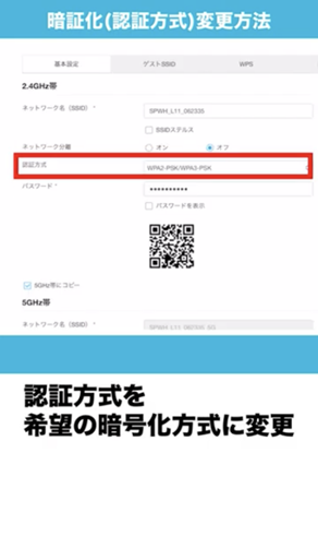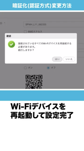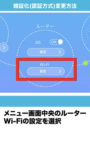HOME設定ツールにログイン後、各種設定・接続情報画面より「ルーター」の「Wi-Fi」の表示下にある「設定」をクリック > 基本設定を選択 > 画面内の「認証方式」を希望の暗号化方式に変更 > Wi-Fiデバイスを再起動して設定完了