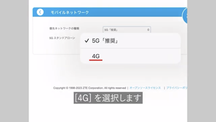 Speed Wi-Fi HOME設定ツールにログイン後 > 各種設定・接続情報画面より「ルーター」の表示下にある「設定」をクリック >「モバイルネットワーク」をクリック > 5G「推奨」→4Gを選択し、適用をクリック