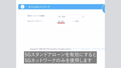 Speed Wi-Fi HOME設定ツールにログイン後 > 各種設定・接続情報画面より「ルーター」の表示下にある「設定」をクリック >「優先ネットワークの種類」の項目の 4G→5G「推奨」 を選択 > 「5G スタンドアローン」を有効にして、適用をクリック