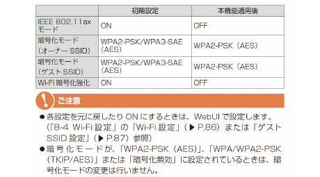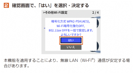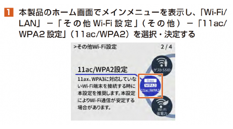 ホーム画面で「▲▼」いずれかのボタンを押す >「Wi-Fi/LAN」 >「その他 Wi-Fi 設定」(その他)>「11ac/WAP2 設定」(11ac/WPA2)を選択・決定し、確認画面で「はい」を選択・決定する