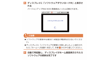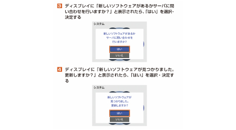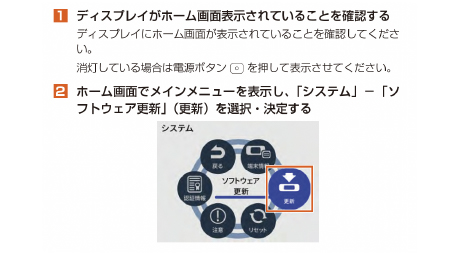 ホーム画面で「▲▼」いずれかのボタンを押す > 「システム」 > 「ソフトウェア更新」(更新)を選択・決定する>ディスプレイに「新しいファームウェアが見つかりました。更新しますか?」と表示されたら、[はい]を選択・決定する
