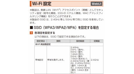 「WebUI」にログイン後、「Wi-Fi設定」>「Wi-Fi 周波数設定」>「帯域設定」より「5GHz( 屋外 144ch 含まない)」に変更